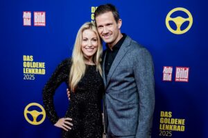 18.11.2025, Berlin: Sébastien Ogier, Rallye-Fahrer, und Andrea Kaiser, Moderatorin, kommen zur Preisverleihung „Das Goldene Lenkrad“ in das Axel-Springer-Hochhaus. Foto: Christoph Soeder/dpa