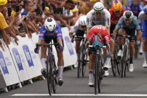 „Es war eine sehr leichte Etappe, jeder wollte sich für die Pyrenäen schonen. Es gab einige Stürze, ich hoffe, alle sind in Ordnung. Es war sehr hektisch. Am Ende hatte ich Krämpfe. Ich habe das Rad meiner Teamkollegen verloren, aber auf der Zielgeraden habe ich Mathieu van der Poel wiedergefunden und er hat meinen Sprint auf außergewöhnliche Weise eingeleitet“, sagte Philipsen. Der 25-Jährige – Spitzname Jasper Desaster – ist in den schnellen Finals eine Klasse für sich und hatte bereits am Montag gesiegt.