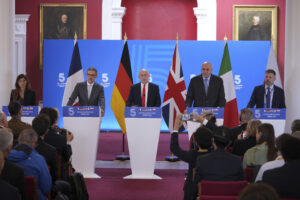 10.09.2025, Großbritannien, Woolwich: Großbritanniens Verteidigungsminister John Healey (3.v.l.), Italiens Verteidigungsminister Guido Crosetto (2.v.r), Polens Direktor für internationale Sicherheitspolitik Marcin Kazmierski (r), Deutschlands Staatssekretär im Bundesministerium der Verteidigung Jens Plötner (.2.v.l) und Alice Rufo, Generaldirektorin für internationale Beziehungen und Strategie des französischen Streitkräfteministeriums (l) sprechen zu den Medien während einer Pressekonferenz nach einem Treffen der Verteidigungsminister der E5-Gruppe (Großbritannien, Frankreich, Deutschland, Italien und Polen). Foto: Kin Cheung/AP/dpa