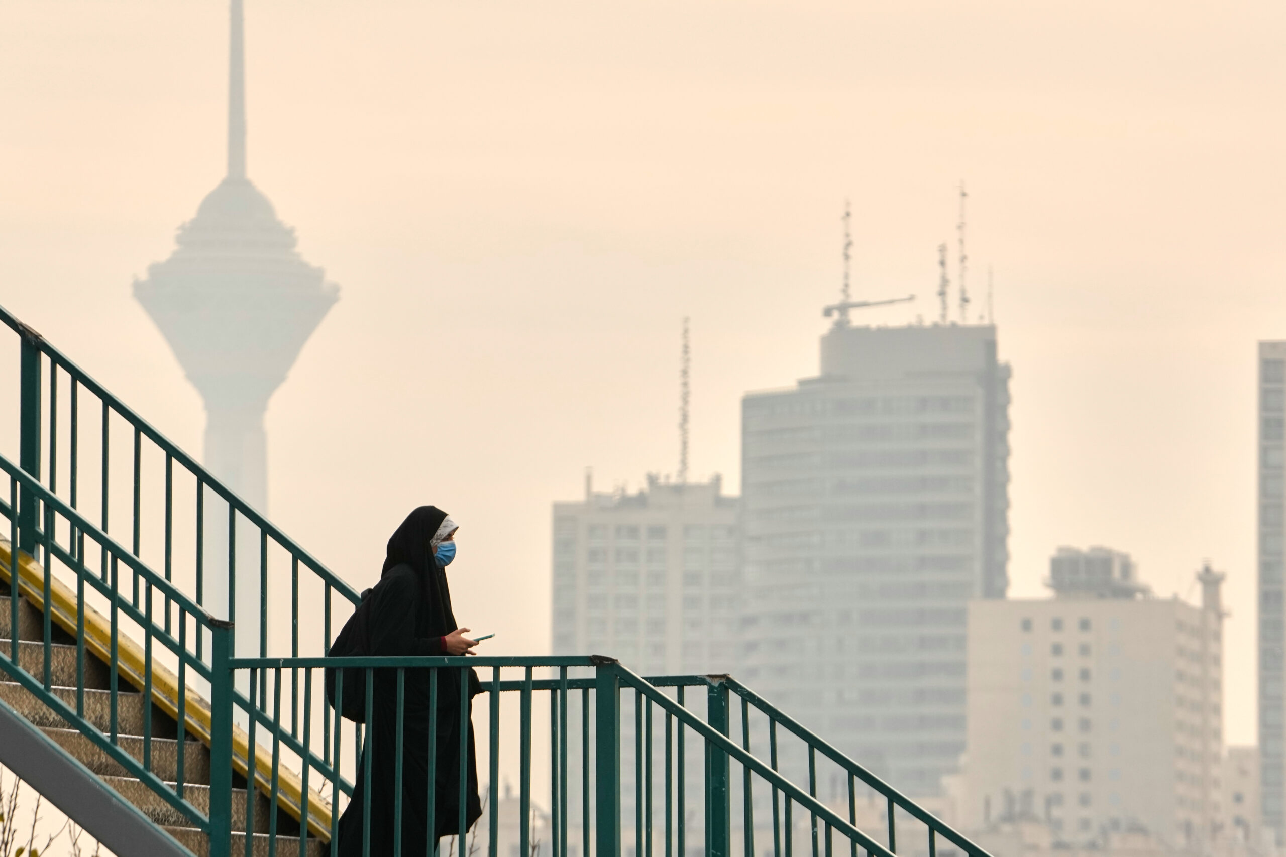 07.12.2025, Iran, Teheran: Eine Frau geht über eine Überführung, während sie eine Gesichtsmaske trägt und der Milad-Telekommunikationsturm und Wohngebäude bei hoher Luftverschmutzung in Teheran zu sehen sind. Foto: Vahid Salemi/AP/dpa
