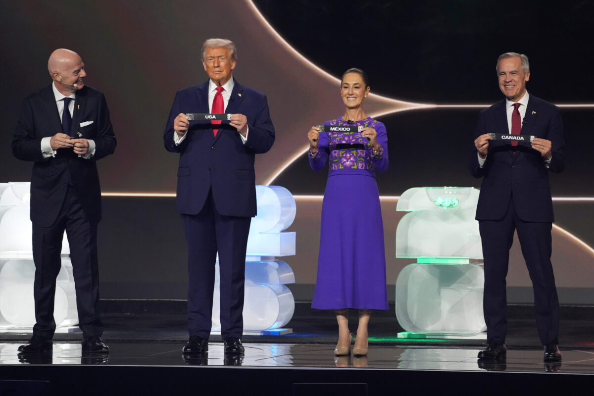 05.12.2025, USA, Washington: FIFA-Präsident Gianni Infantino (l-r) steht mit US-Präsident Donald Trump, der mexikanischen Präsidentin Claudia Sheinbaum und dem kanadischen Premierminister Mark Carney auf der Bühne. Foto: Evan Vucci/AP/dpa