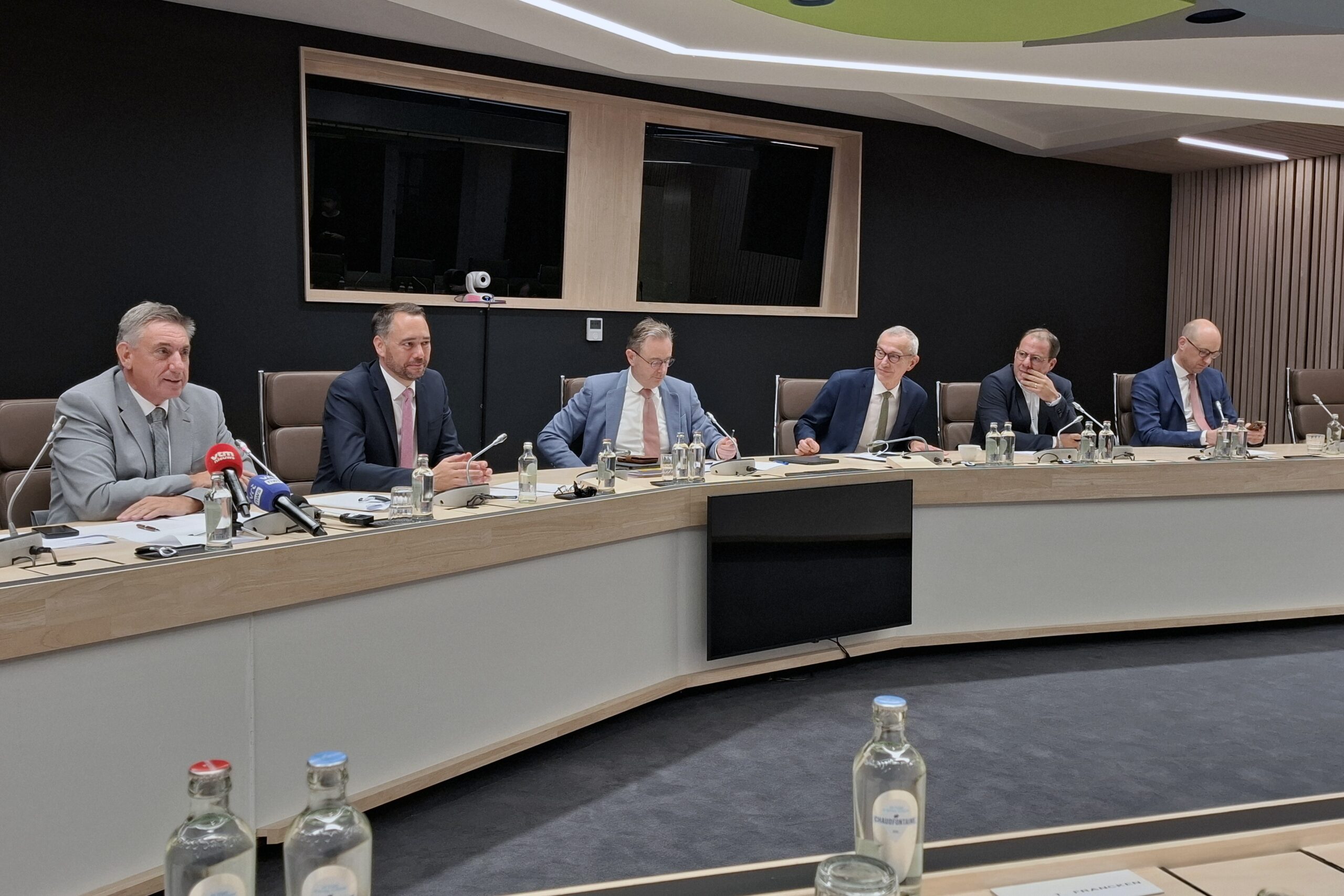 Voll hinter Premierminister Bart De Wever (3.v.l.) steht Außenminister Maxime Prévot (2.v.l.)), der ebenfalls Alarm schlug hinsichtlich der Risiken, die Belgien drohen, wenn die bei Euroclear geparkten Russen-Gelder der Ukraine übergeben werden. Foto: Belga