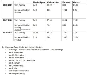Die Schuljahre und akademischen Jahre 2026–2027, 2027–2028 und 2028–2029 beginnen jeweils am 1. September und enden jeweils am 30. Juni.