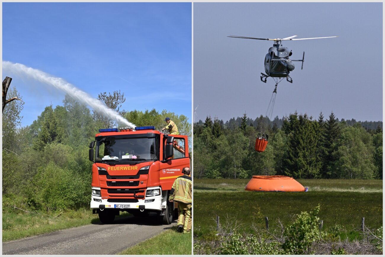 30.05.2023, Belgien, Eupen: Die Feuerwehr versucht einen Brandherd im Venn zu löschen. Foto: Ralf Roeger/dmp-press/dpa