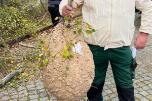 „Die Jungköniginnen haben das Nest zum jetzigen Zeitpunkt bereits verlassen und überwintern an geschützten Orten. Die im Nest verbleibenden Hornissen sind kaum noch aktiv und sterben bei den sinkenden Temperaturen ab. Sekundärnester werden im darauffolgenden Sommer nicht erneut bezogen und zerfallen im Laufe des Winters von selbst. Eine Entfernung von Sekundärnestern ist nur dann sinnvoll, wenn eine akute Gefahr besAsiatische Hornissen seien eine invasive Art, die eine ernsthafte Bedrohung für die heimische Biodiversität darstellen, insbesondere für Wild- und Honigbienen. Die frühzeitige Erkennung und Entfernung von sogenannten Primärnestern in geringerer Höhe, die vor allem im Frühjahr entstehen, sei entscheidend, um die Ausbreitung der Asiatischen Hornisse einzudämmen.so sie Stadt.