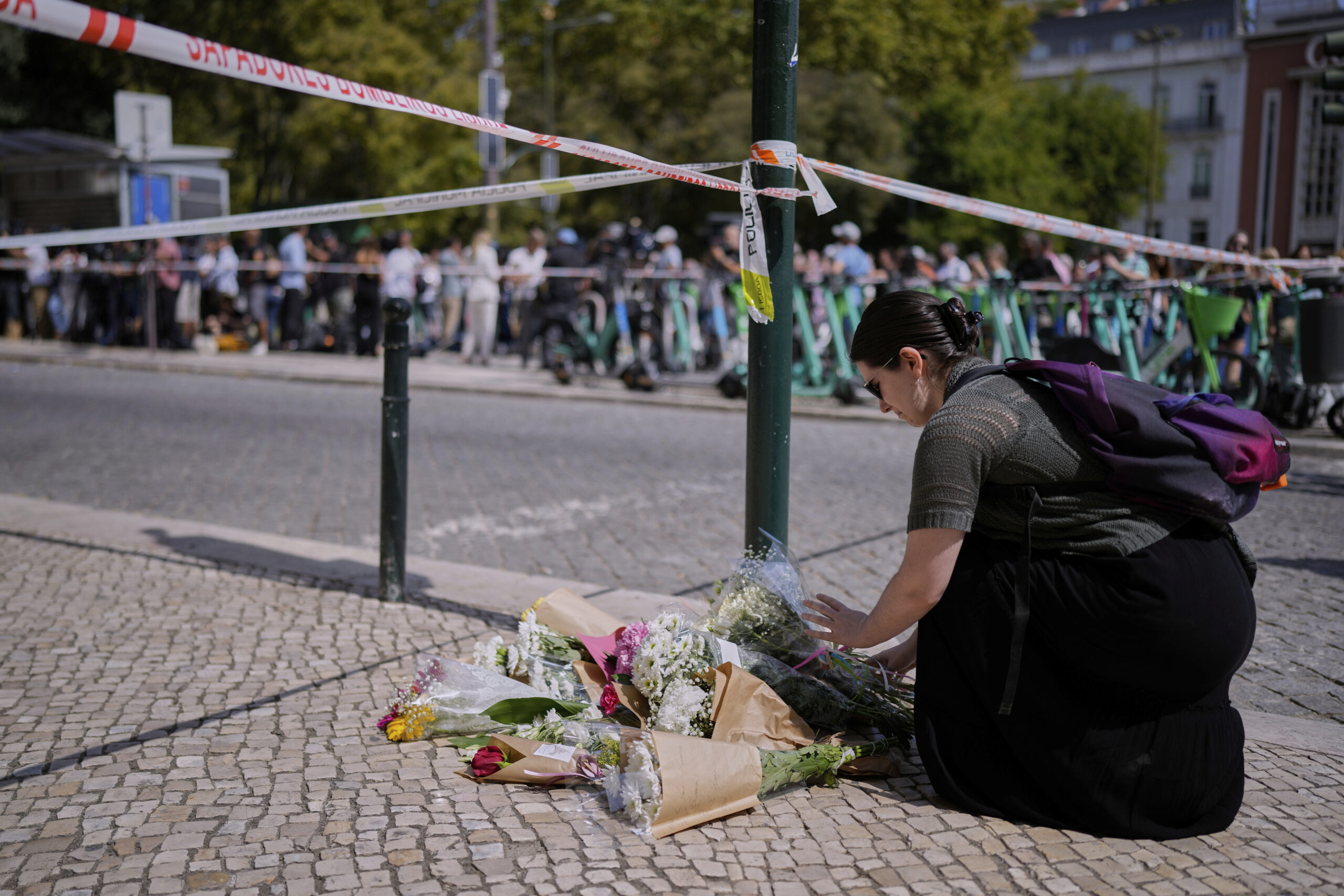 04.09.2025, Portugal, Lissabon: Eine Frau legt Blumen an der Stelle ab, an der eine Straßenbahn für Touristen entgleist ist. Foto: Armando Franca/AP/dpa