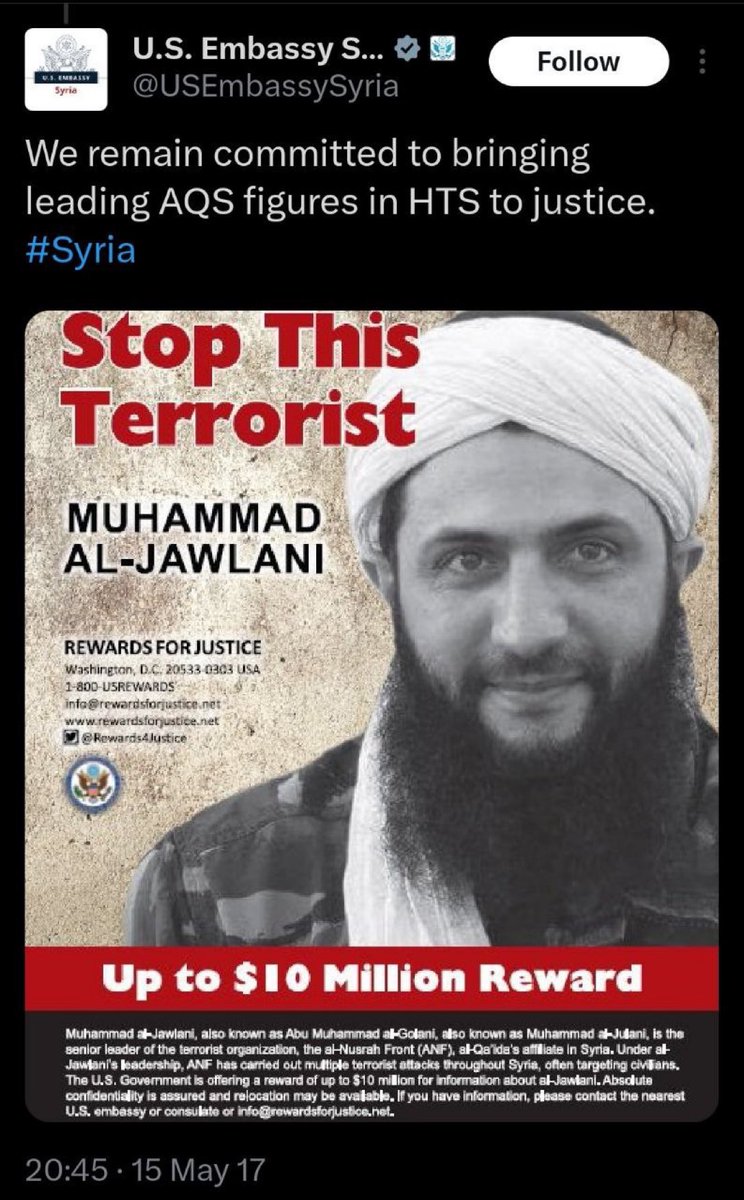 In den Vereinigten Staaten steht Muhammad al-Julani immer noch auf der Liste der gefährlichsten Terroristen, und das Angebot einer Belohnung von 10 Millionen US-Dollar für seinen Kopf ist immer noch relevant.