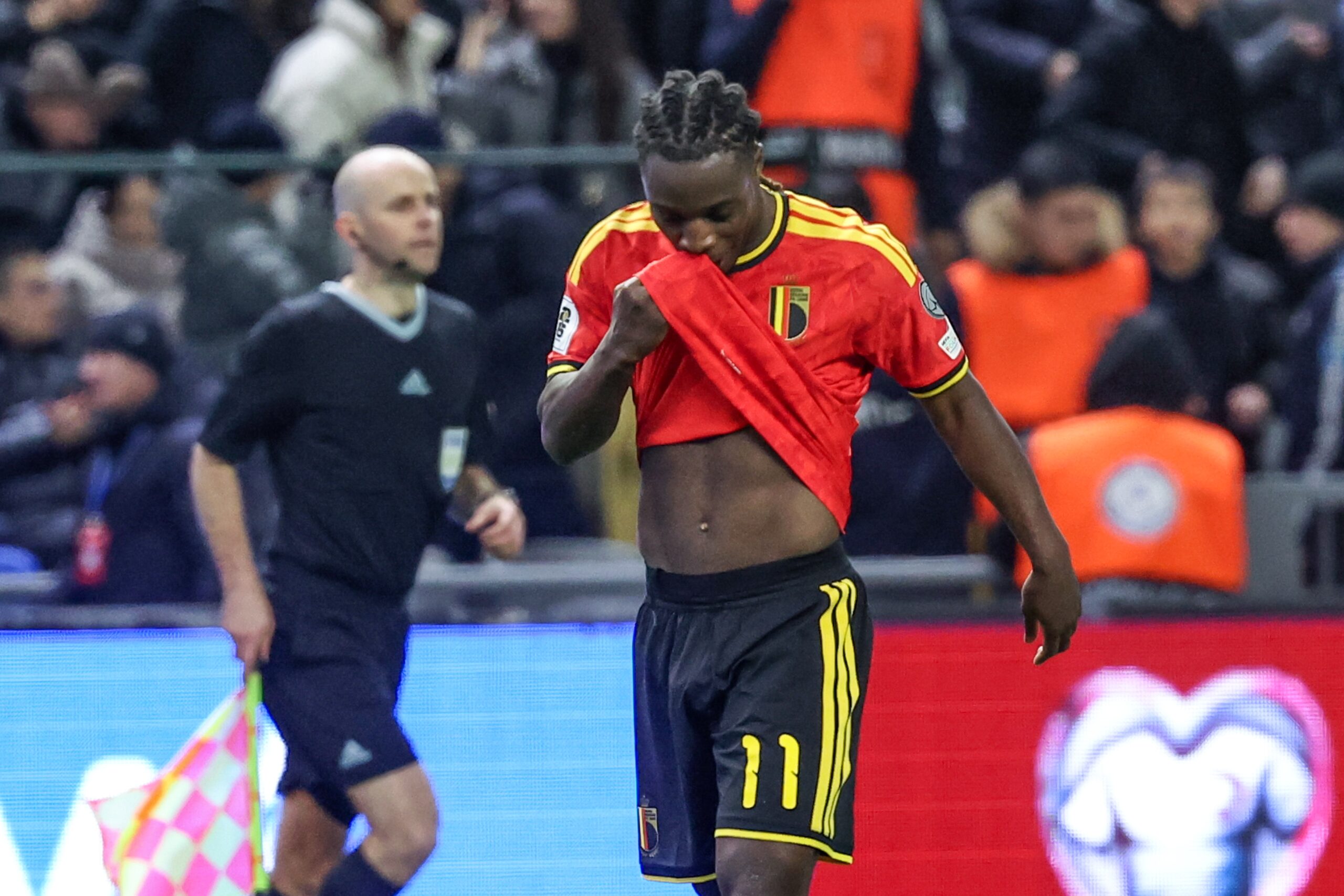 15.11.2025, Kasachstan, Astana: Jérémy Doku von Belgien verlässt enttäuscht den Rasen der Astana Arena nach dem 1:1 gegen Kasachstan. Foto: Belga