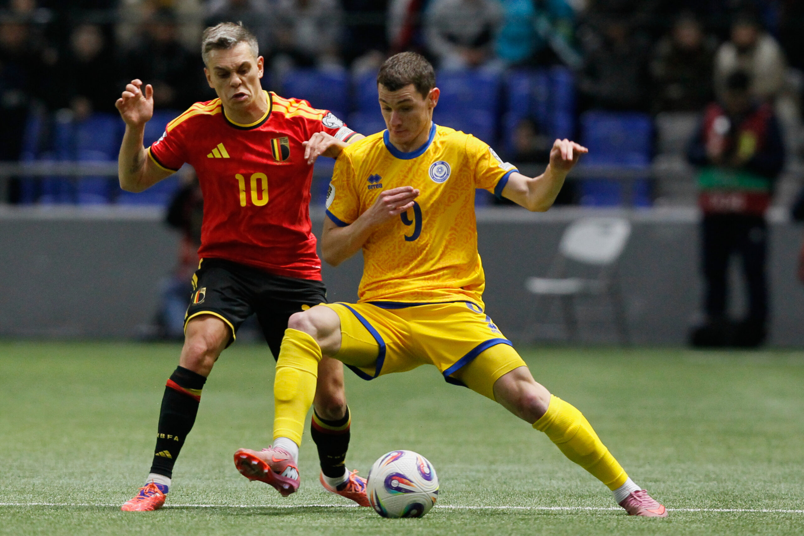 15.11.2025, Kasachstan, Astana: Belgiens Leandro Trossard (l) und Kasachstans Islam Chesnokov kämpfen um den Ball. Foto: Uncredited/AP/dpa