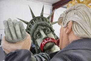 10.02.2026, Rheinland-Pfalz, Mainz-Mombach: Ein Motivwagen des Mainzer Karnevalsvereins für den bevorstehenden Rosenmontag zeigt den US-Präsidenten Donald Trump, der versucht, eine sich windende Freiheitsstatue zu küssen, deren Mund mit einem „MAGA“- Band umschlungen ist. „MAGA“ steht für „Make America Great Again“. Foto: Boris Roessler/dpa