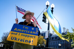 17.10.2025, USA, Washington: Ein Passant steht mit der ukrainischen und US-amerikanischen Flagge und einem Plakat mit der Aufschrift „I am American and I support Ukraine!“ am Weißen Haus. Foto: Kay Nietfeld/dpa