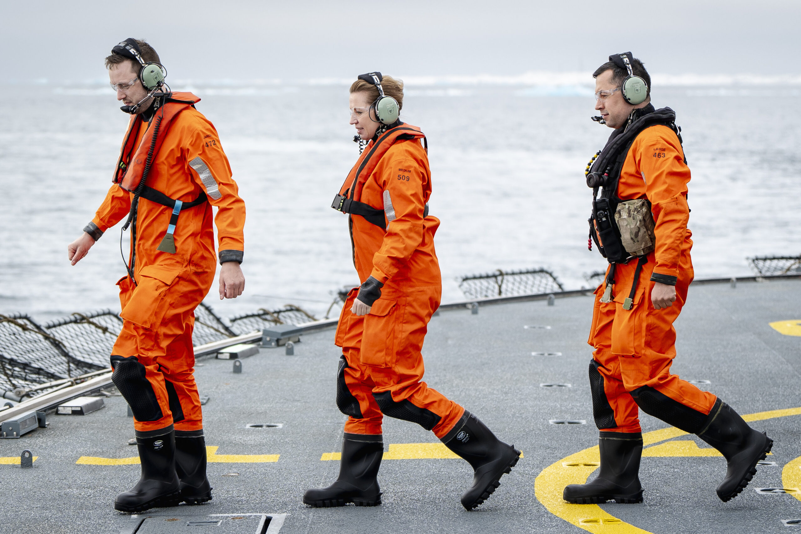 03.04.2025, Grönland, Nuuk: Dänemarks Premierministerin Mette Frederiksen (M) Grönlands amtierender Regierungschef Múte Bourup Egede (r) und Grönlands neu gewählter Regierungschef Jens-Frederik Nielsen gehen nach einem Ausflug mit einem Sea-Hawk-Hubschrauber der dänischen Marine vom Inspektionsschiff Vaedderen in den Gewässern um Nuuk. Foto: Mads Claus Rasmussen/Ritzau Scanpix Foto/AP/dpa