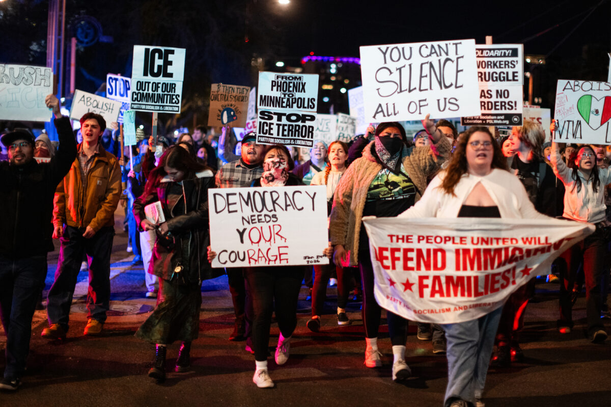 24.01.2026, USA, Phoenix: Menschen tragen Schilder und marschieren während eines Protestes gegen die bundesstaatliche Einwanderungsbehörde (ICE) in Phoenix. Foto: Caitlin O’Hara/AP/dpa