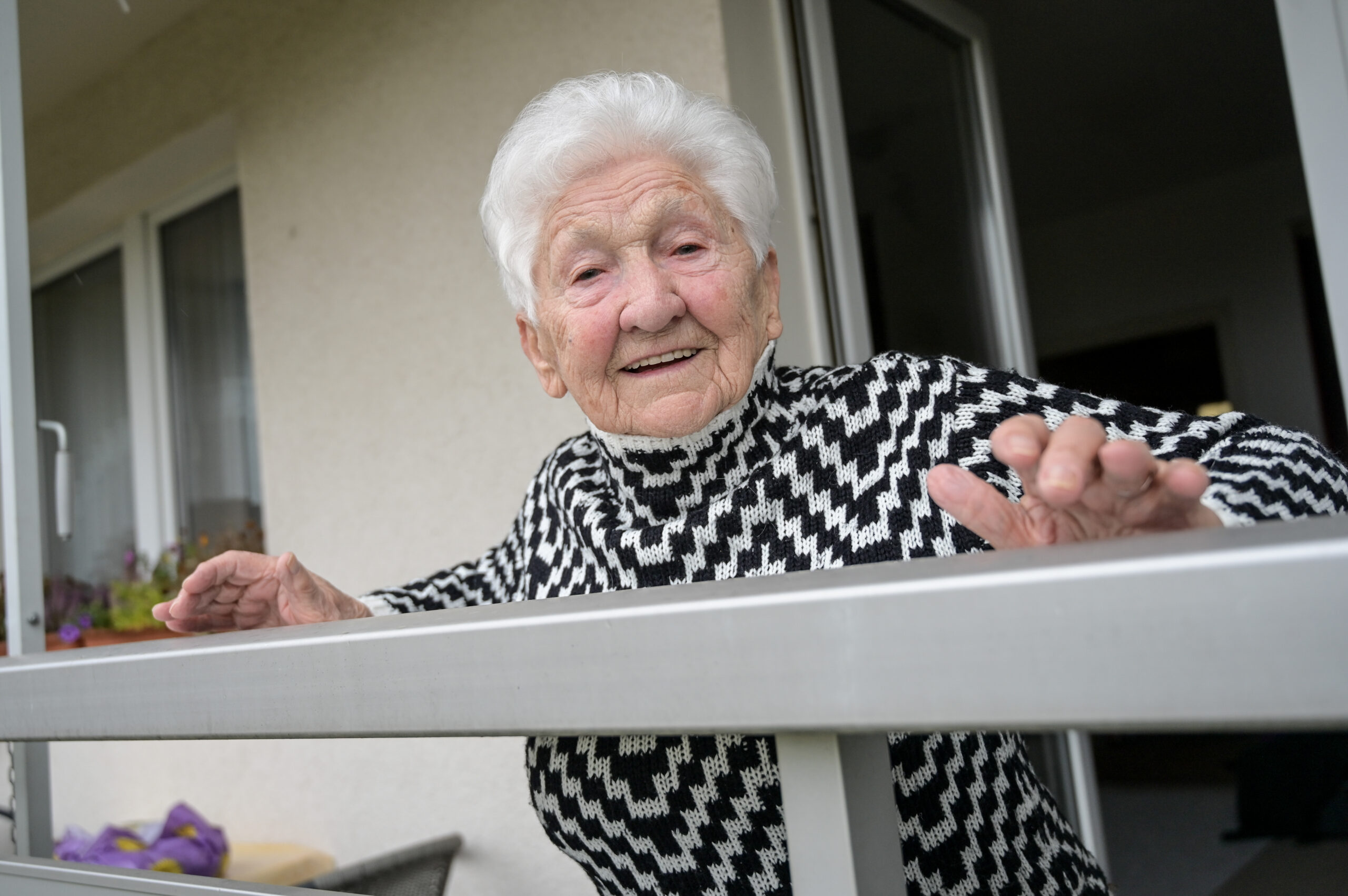 20.11.2025, Sachsen-Anhalt, Halle (Saale): Johanna Quaas feiert ihren 100. Geburtstag. Täglich macht sie noch ihre Fitness-Übungen am Balkongeländer. Foto: Heiko Rebsch/dpa