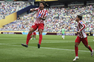 19.06.2025, USA, Seattle: Axel Witsel (l) im Dress von Atlético Madrid. Hier jubelt er nach einem Tor. Der 36-Jährige spielt inzwischen für den FC Girona. Foto: Ryan Sun/AP/dpa