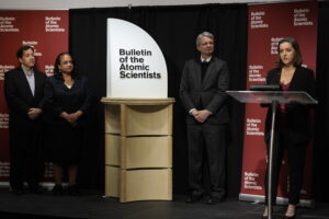 23.01.2026, USA, Washington: Die Mitglieder des Bulletin of the Atomic Scientists, von links Jon B. Wolfsthal, Asha M. George, Steve Fetter und Alexandra Bell, enthüllen die Weltuntergangsuhr, die auf 85 Sekunden vor Mitternacht eingestellt ist. Foto: Pablo Martinez Monsivais/AP/dpa