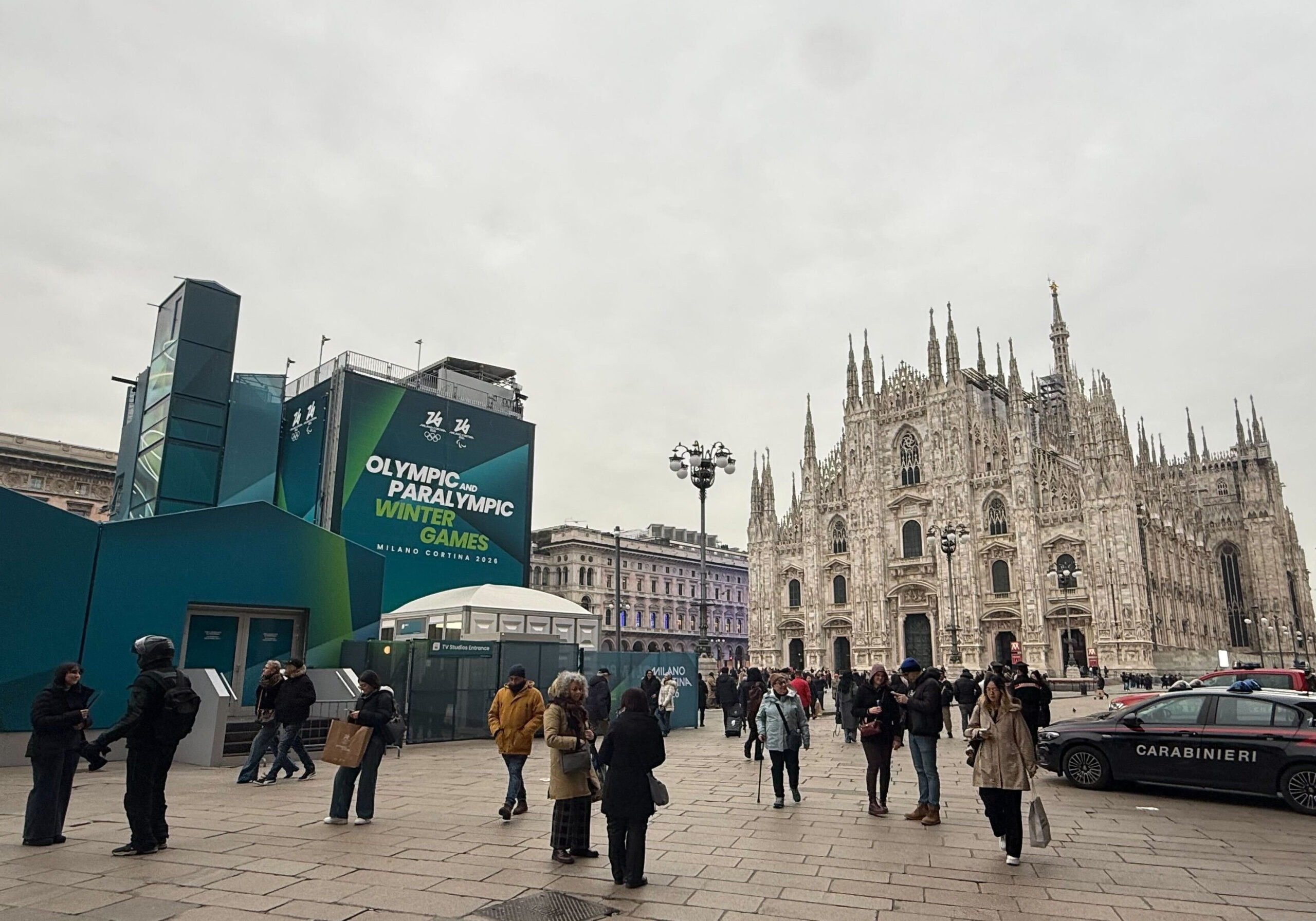 27.01.2026, Italien, Mailand: In der Olympia-Stadt Mailand steht vor dem Dom nun ein Megastore für Souvenirs der 25. Olympischen Winterspiele. Foto: Christoph Sator/dpa