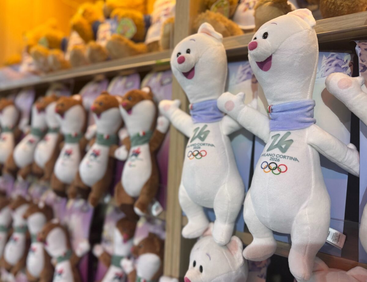 27.01.2026, Italien, Mailand: Vor Beginn der 25. Olympischen Winterspiele werden die Maskottchen Milo (r) und Tina (l) verkauft. Foto: Christoph Sator/dpa