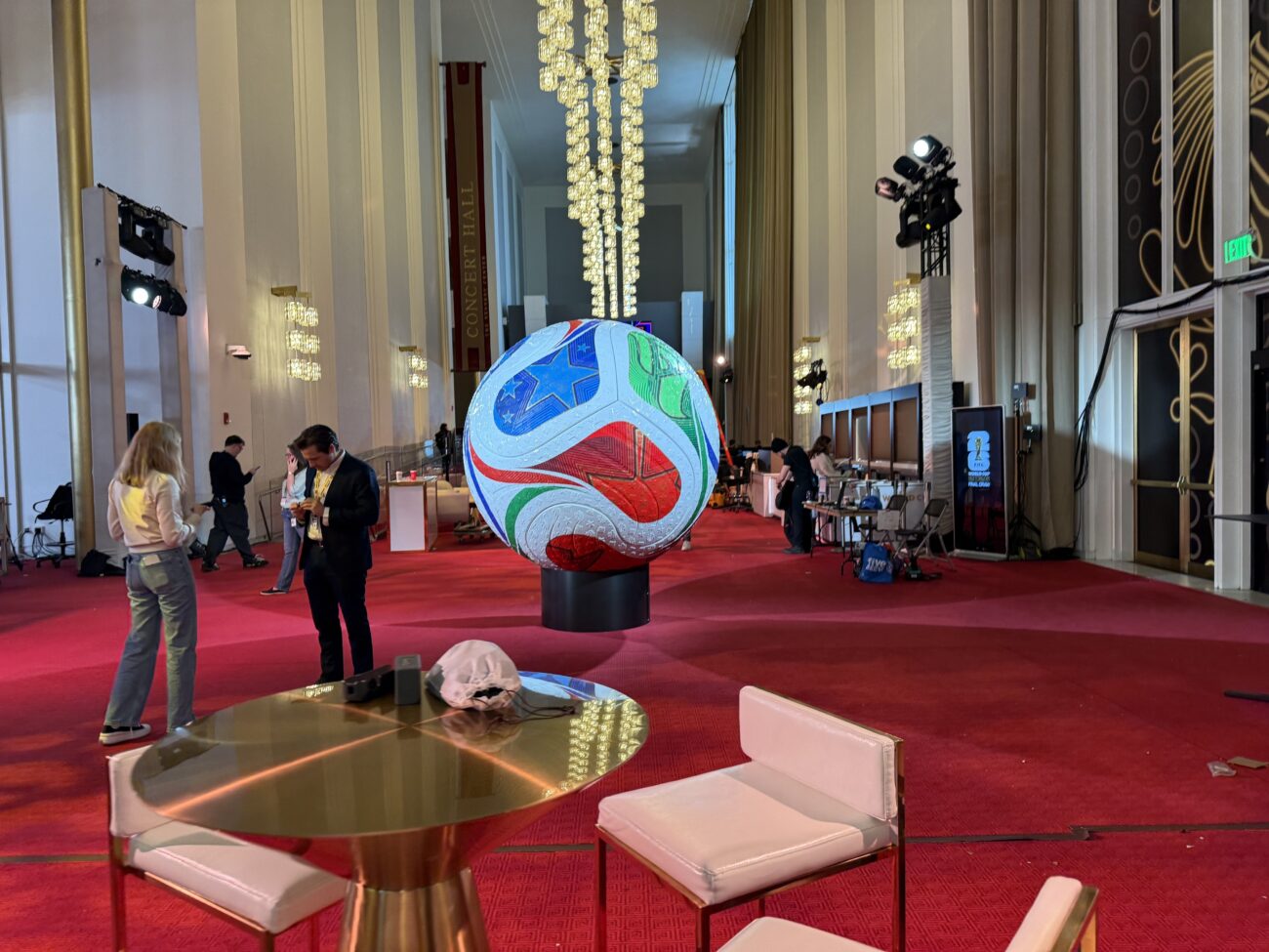 04.12.2025, USA, Washington DC: Vor der Auslosung der FIFA Fußball-WM 2026 reinigt eine Reinigungskraft den roten Teppich neben einem Schild im Kennedy Center in Washington. Foto: Gent Shkullaku/ZUMA Press Wire/dpa