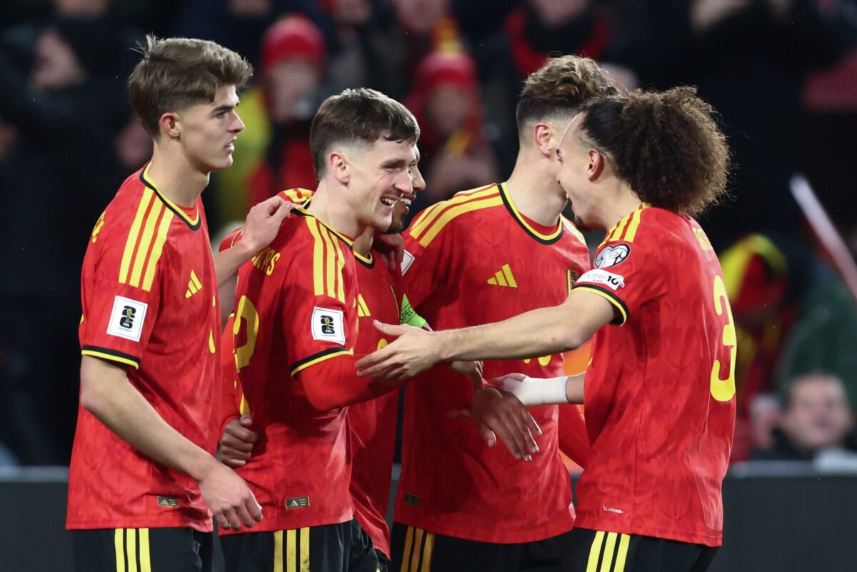 18.11.2025, Belgien, Lüttich: Belgiens Alexis Saelemaekers (2.v.l.) jubelt nach seinem Tor. Foto: Bruno Fahy/Belga/dpa