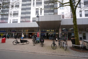 31.03.2026, Hamburg: Passanten gehen in die Einkaufspassage an der Straße Große Bergstraße, wo ein Wolf am Montag eine Frau verletzt hat. Foto: Marcus Brandt/dpa